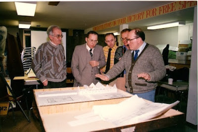 Colour photo above: Ernst Zündel, in Toronto in the 1980s, displaying before Robert Faurisson, Fred Leuchter, Robert Miller and Ditlieb Felderer the building plans of the five Auschwitz and Birkenau crematoria, discovered by R. Faurisson in Poland on March 19, 1976. Those plans, kept hidden until then, enabled the creation of scale models making it obvious that the alleged gigantic homicidal gassing operations were physically impossible. See, in this regard, 1) An Engineering Report on the Alleged Execution Gas Chambers at Auschwitz, Birkenau and Majdanek (Poland) prepared by Fred A. Leuchter on April 5, 1988, 193 p.; 2) Did Six Million Really Die? Report of the Evidence in the Canadian “False News” Trial of Ernst Zündel – 1988, edited by Barbara Kulaszka, 1992, viii-564 p.
